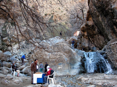 Слизаме и ни поема местен гид, който ни повежда нагоре към някакви водопади. Пресичаме един от въжените мостове и минаваме по места, които със сигурност могат да се оценят като опасни за живота. Почти никъде не е достатъчно обезопасено – чудя се дали не стават инциденти. Туристическият поток е интензивен, на някои места е проблем разминаването между онези, които се качват, и другите, които слизат. Планината е все по-впечатляваща и внушителна. Въпреки това, по целия път има разхвърляни къщи, както и доста търговци, които продават сувенири. Най-горе си купувам джунджурии от бербер, който обяснява, че идва от планината и не плаща данъци, защото няма кой да ги събира. Не че съм го питал изрично. Най-горе има будка с няколко маси наоколо. Почиваме си и пием ментов чай. Надолу пък си купувам сусам. Вкусен е – по-твърд и малко по-сух от онзи, който си спомням от моето детство.